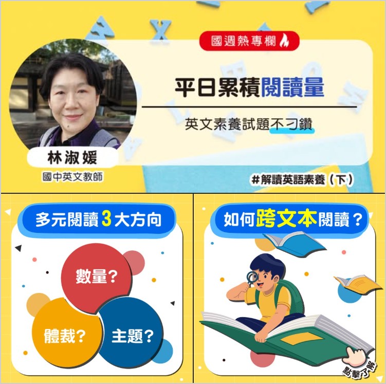 全文分三部分逐月刊出,從「素養」的定義、閱讀理解歷程到平日親子共讀,層層擴展,希望英語閱讀不再只為考試,而是真正落實在日常生活的「素養」。請點選下列標題,連結到國語週刊官網的專欄瀏覽。依合約,一年後我再把文章放在我的網站。